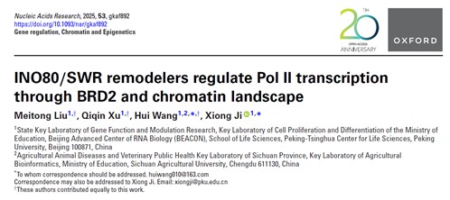 2025年9月18日 ,必赢bwin线路检测中心、北大-清华生命科学联合中心季雄团队在Nucleic Acids Research发表了题为“INO80/SWR remodelers regulate Pol II transcription through BRD2 and chromatin landscape”的研究论文。在本研究中,季雄团队首先鉴定了受INO80、P400与SRCAP复合物直接调控的靶基因。在机制层面,研究发现H2A.Z在核小体上的占位并不能充分解释INO80/SWR对靶基因的调控作用;然而,该过程很可能是通过BRD2介导的Pol II转录起始调控来实现的。此外,研究进一步阐明了INO80、P400和SRCAP复合物之间的相互调控关系:INO80能够协助招募P400和SRCAP,而P400和SRCAP对INO80的染色质占位则未见显著影响。