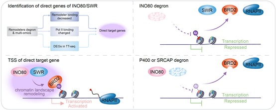 总体而言,本研究揭示了INO80/SWR染色质重塑复合物通过调控BRD2结合和染色质景观来精细控制Pol II转录的分子机制。该工作不仅深化了我们对Pol II转录调控网络的理解,也为发育与疾病相关的基因表达调控研究提供了新的思路。