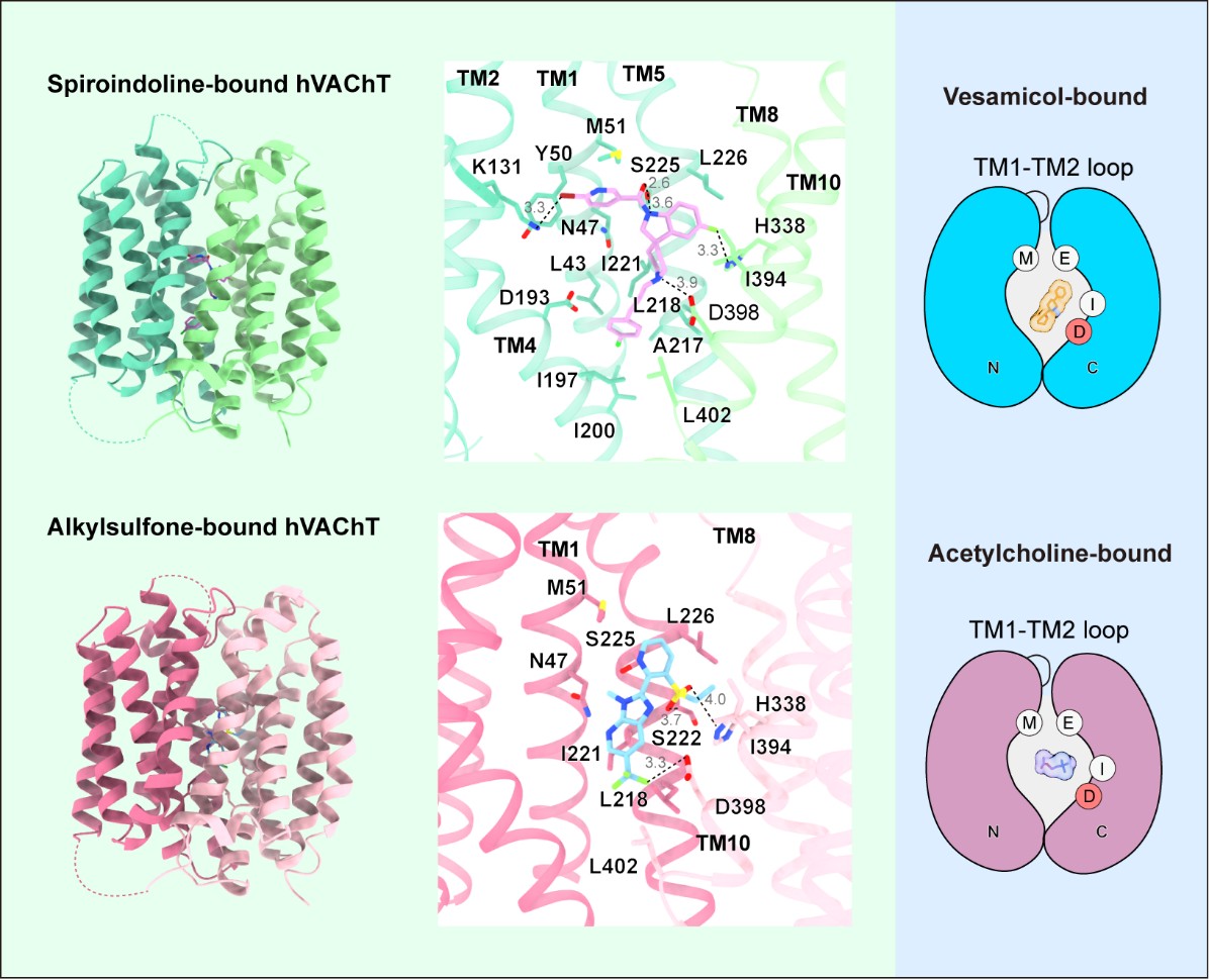 必赢bwin线路检测中心和生命科学联合中心张哲课题组于2025年10月30日在Structure期刊上发表题为“Structural basis of VAChT inhibition by spiroindolines and alkylsulfones”的研究论文。该研究通过冷冻电镜解析了人源VAChT蛋白与两种新型抑制剂——Spiroindoline和Alkylsulfone结合的高分辨率结构,并结合功能实验系统阐明其抑制机制。结合课题组此前发表的VAChT与底物及Vesamicol结合的结构(Zhang et al. Cell Research 2024),本研究完整揭示了VAChT在识别不同配体过程中的构象偏好与结合模式差异(图1)。