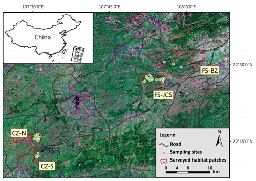 研究分析了来自白头叶猴主要分布区崇左和扶绥的41个社群(social groups)的214份独立个体样品,获得15个物种特异的多态性微卫星位点、1个性别差异位点(Dead-box)和一段线粒体DNA控制区的基因型数据。结果显示白头叶猴的遗传多样性水平与濒危状态和种群数量相似的其他灵长类物种相比更低。白头叶猴种群表现出崇左(CZ)-扶绥九重山(FS-JCS)-扶绥布噂(FS-BZ)的遗传结构划分,这三个遗传种群间已经出现了显著的遗传分化,它们之间个体迁移率低。大片非栖息地区域(农田、村庄等)和地理距离是造成种群遗传结构最主要的景观因子。因此,建议通过恢复栖息地植被、减少栖息地内人为活动以及在相邻栖息地片区之间建立迁移廊道等方法,促进猴群间的自然基因交流,避免小种群遗传隔离,以保护种群遗传多样性,保障该物种的长期生存和进化潜力。
